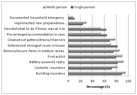 Statistical differences were found between single households and multi-person households across a range of preparedness measures. Multi-person households were more likely to implement household protection measures (such as securing outdoor items, having current insurance etc.) whereas single person households were more likely to implement preparedness planning measures (such as deciding what to do if home is at risk, pre-arranging accommodation in case of evacuation and developing a documented household emergency plan etc.). See Figure 5 for further details.