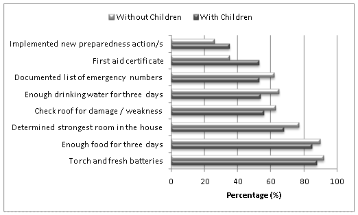 Households without children demonstrated higher levels of preparedness measures compared to households with children, with two exceptions; households with children were more likely to include a member with a current first aid certificate, and more likely to have taken some new measure in the previous 12 months (see Figure 4).