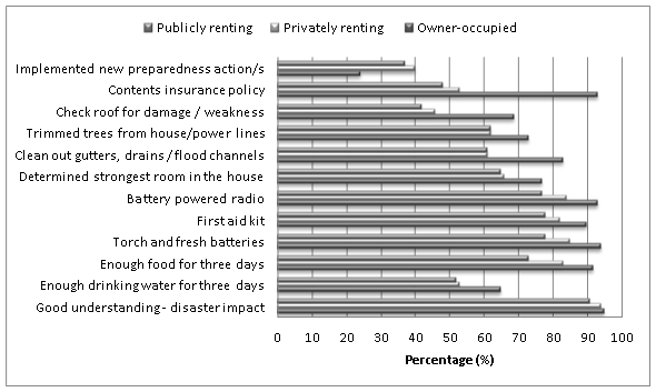 Owner-occupied households showed higher levels of preparedness compared to households that rent, with one exception; households in rented accommodation demonstrated higher percentages for implementing new preparedness measures in the last 12 months (see Figure 3).