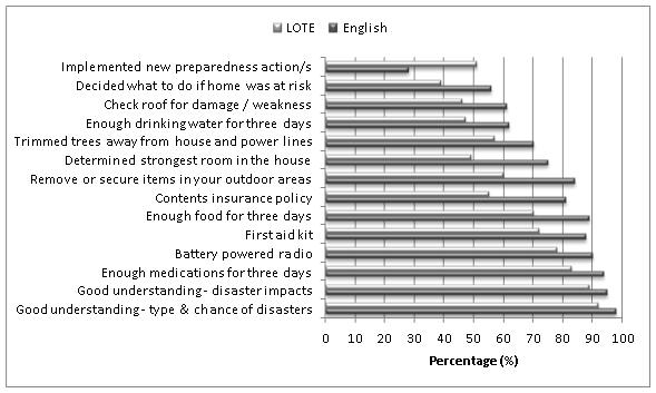The responses to a number of questions illustrated statistical differences between households that usually spoke English at home and households that usually spoke a language other than English (LOTE). In the majority, English speaking household responses were consistently higher than LOTE, with one exception, that LOTE households were more likely to have implemented one or more new preparedness measures in the previous 12 months (see Figure 2).